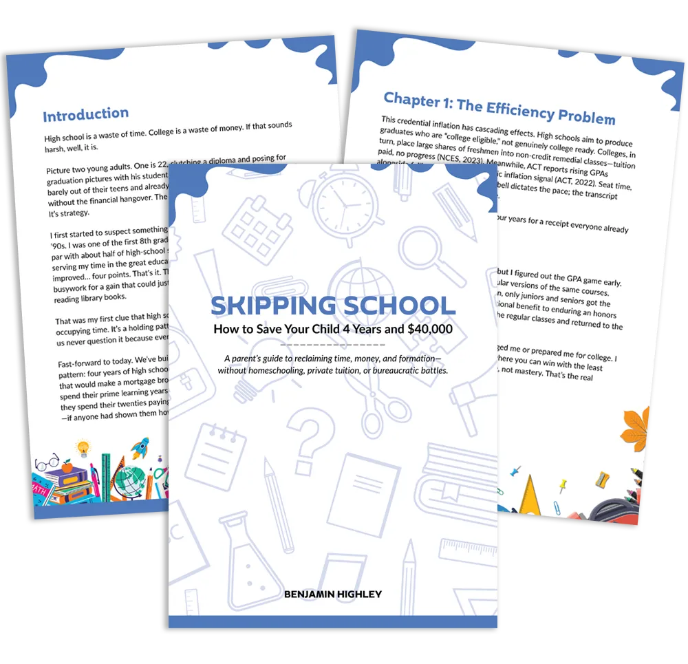 Years later, when I became a parent, that memory wouldn’t leave me. I realized I didn’t want my kids to spend years trapped in the same slow-moving system that had failed to challenge me. Maybe you can relate when I say I wanted better for my kids — faster progress, deeper learning, and real preparation for life. That’s when I started piecing together a different way forward. The plan that grew from that conviction became Skipping School.